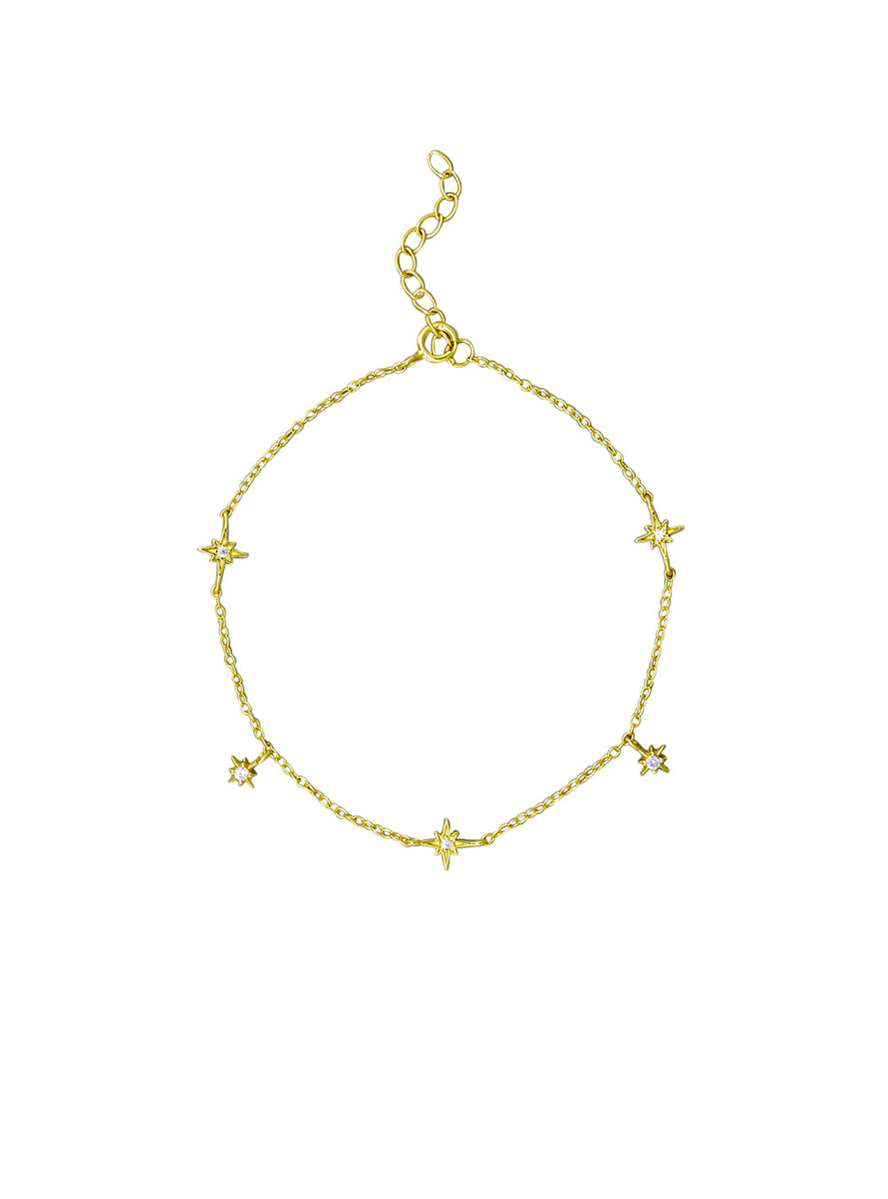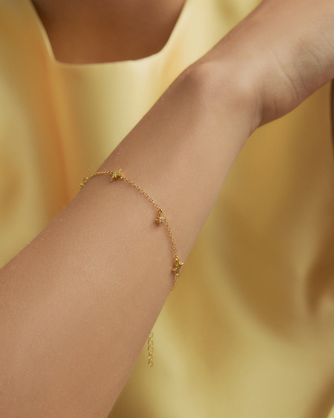 Elevate your jewellery collection with the Ella Bracelet, a finely crafted gold chain adorned with delicate star charms. Each charm is set with shimmering cubic zirconia crystals, adding a subtle sparkle that complements any ensemble. Expertly designed for both everyday wear and special occasions, this bracelet combines timeless elegance with refined detail.