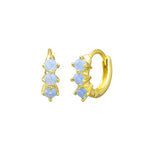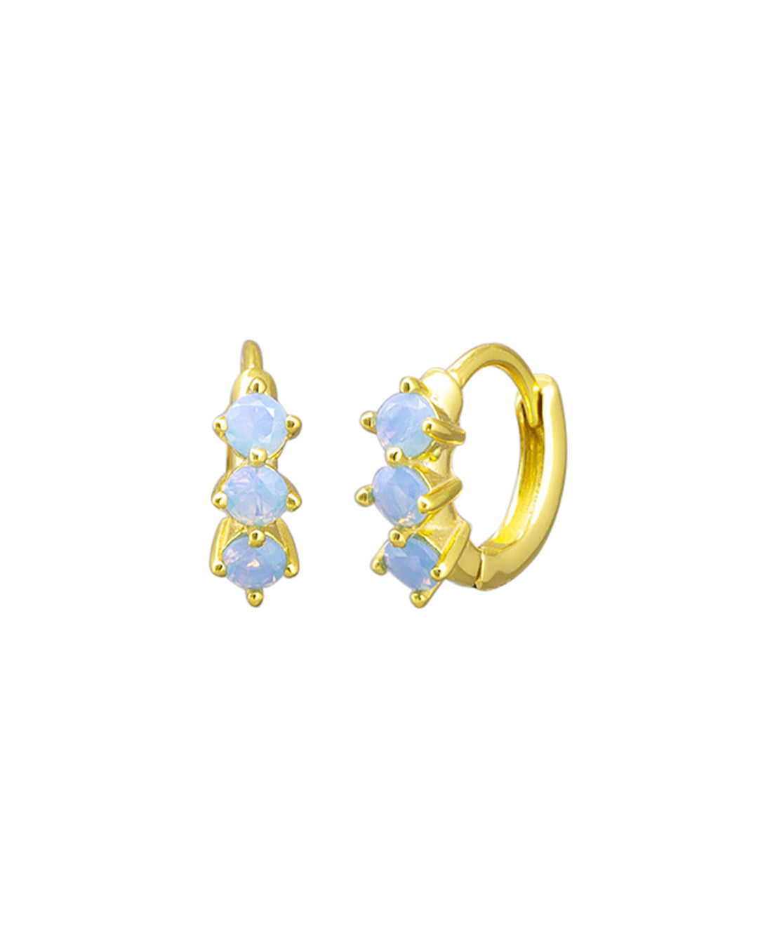 Faye Sleepers present a refined mini hoop silhouette, expertly adorned with three pale blue crystals. These earrings offer a subtle yet sophisticated shimmer, perfect for adding a delicate touch of colour, they can be worn on their own or added to your earring stack.