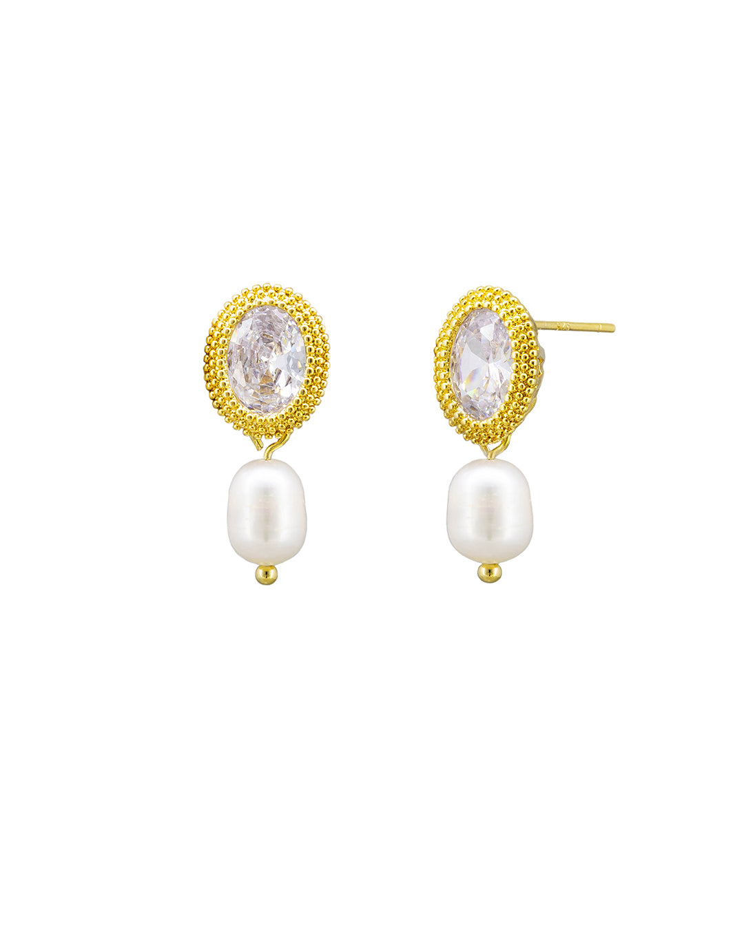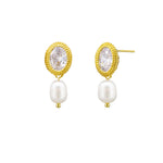 The Kaelani Earrings showcase a sparkling crystal at the top paired with a dangling freshwater pearl. Perfectly timeless and elegant for your upcoming special occasion.