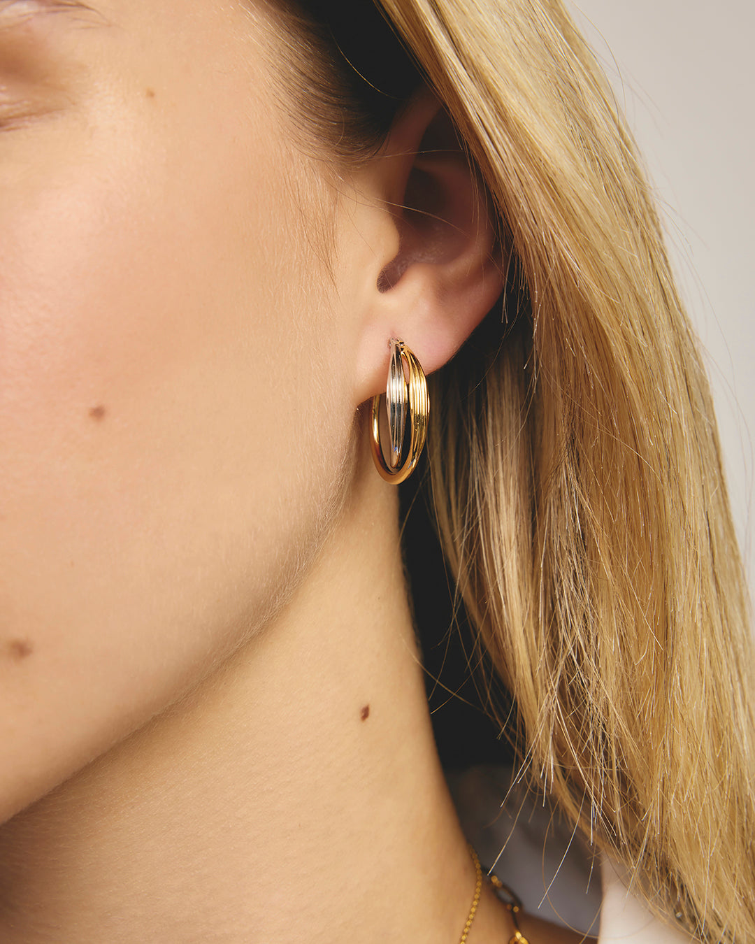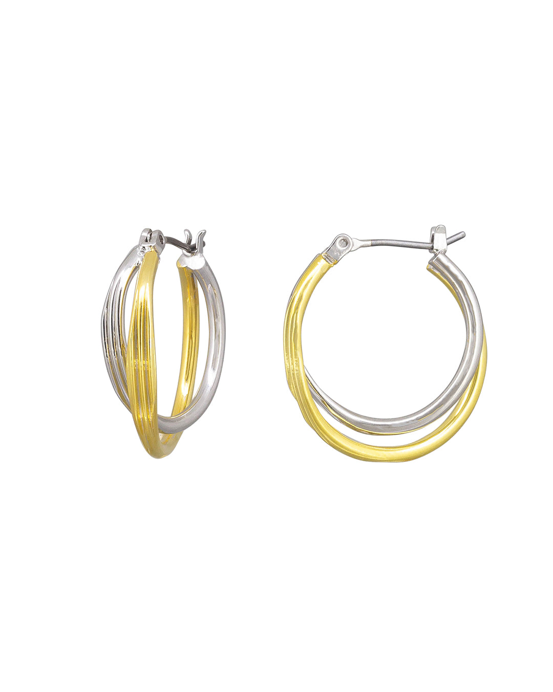 The Kellie Hoops feature gold and silver crisscross hoops. Embrace the trend with these expertly crafted mixed metal hoops.