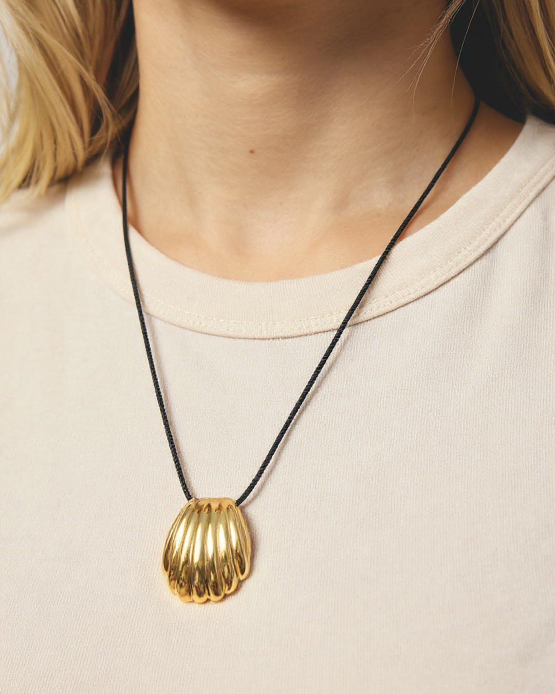 The Caitlin Necklace is bold and eye-catching in its style. An essential addition to your jewellery collection of you like to stand out in the crowd. Featuring a black wrap around rope design with a large gold shell pendant, and an adjustable fastener.