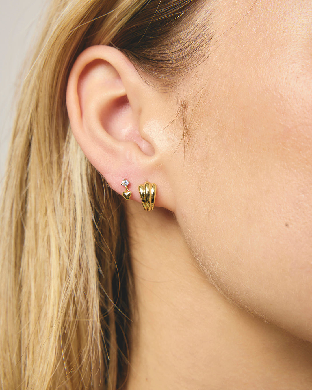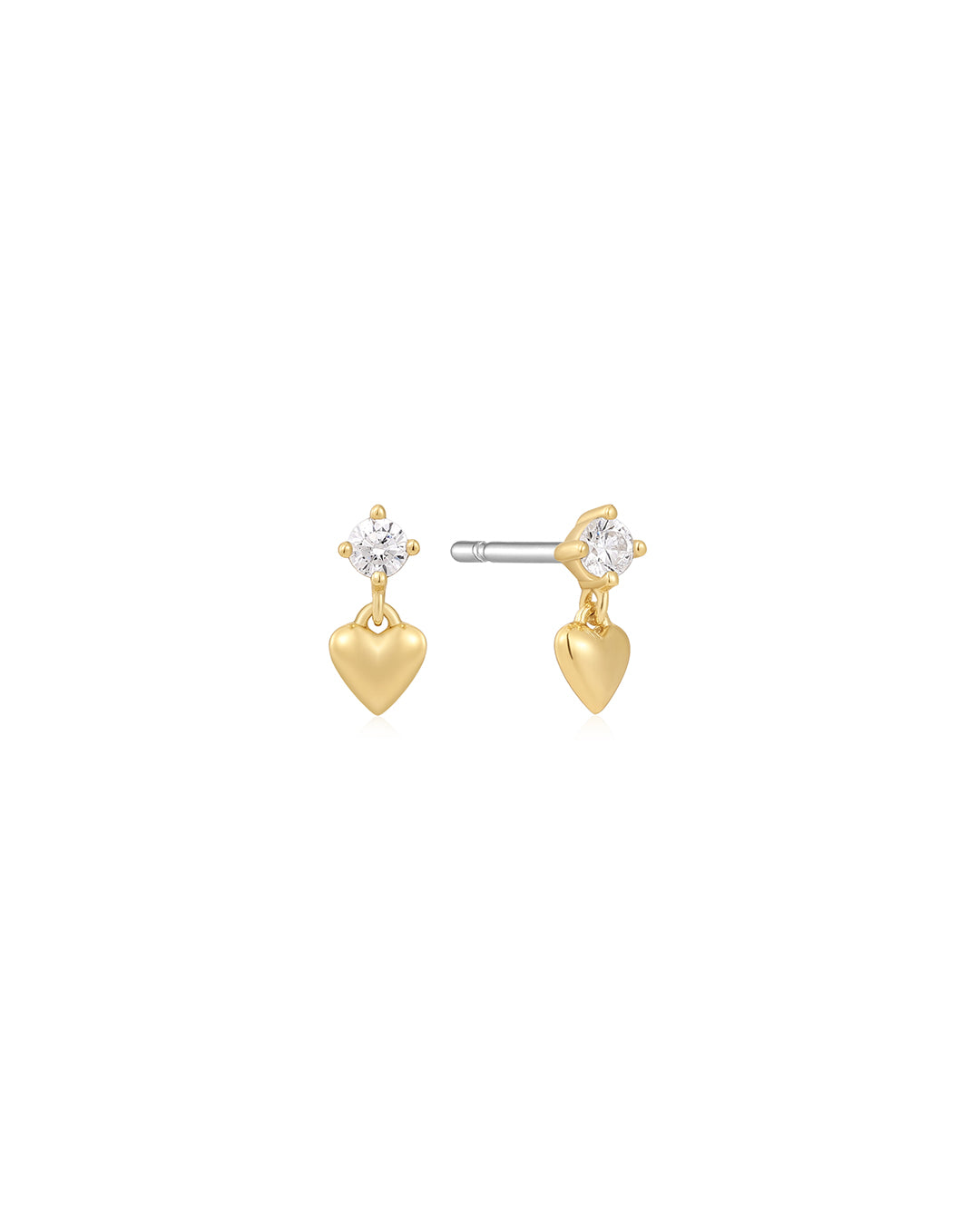 The Lani Studs showcase a sparkling crystal paired with a small, dangling heart charm. These delicate earrings are stylish and perfect for adding a gentle shimmer to your look.