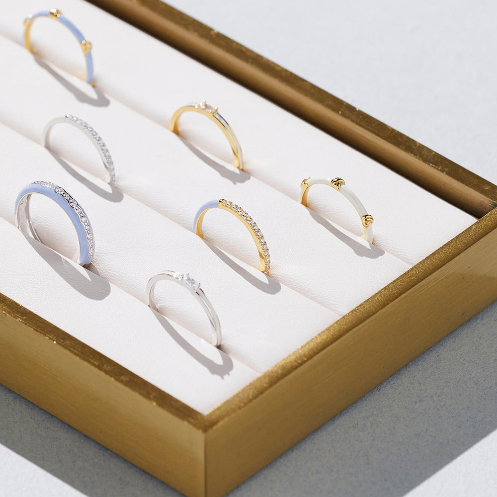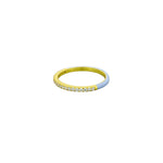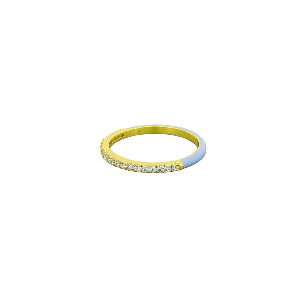 Our Maeve ring is crafted with a half crystal and half light blue enamel design for a one-of-a-kind look. Its thin band is perfect for everyday wear, adding a special touch of glamour to any ensemble.