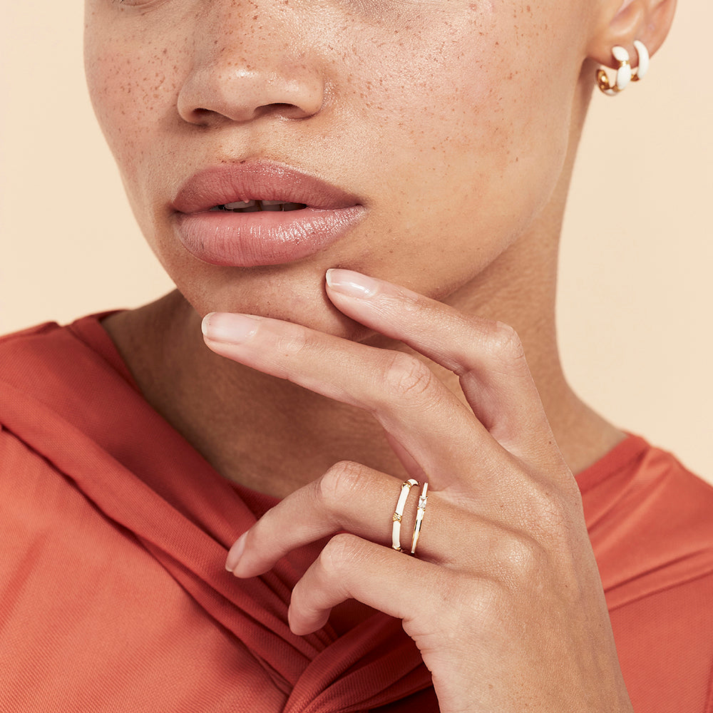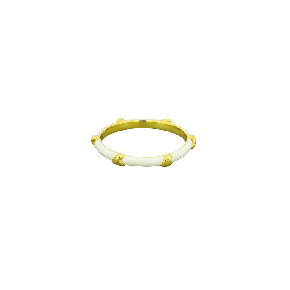 Our Nola Ring is beautifully designed with a thin band and enamel coating, and gold criss cross pattern. Its delicate look adds a touch of elegance to any wardrobe.