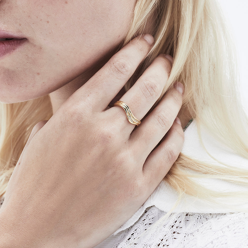 This elegant Paulina Ring features a curved wave shape adorned with sparkling crystals. Perfect for stacking with your favourite rings.