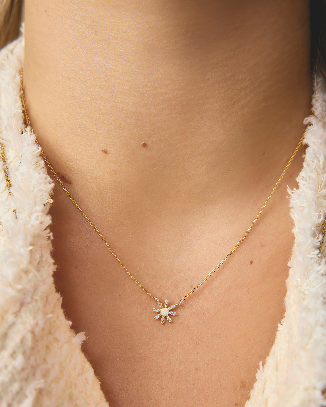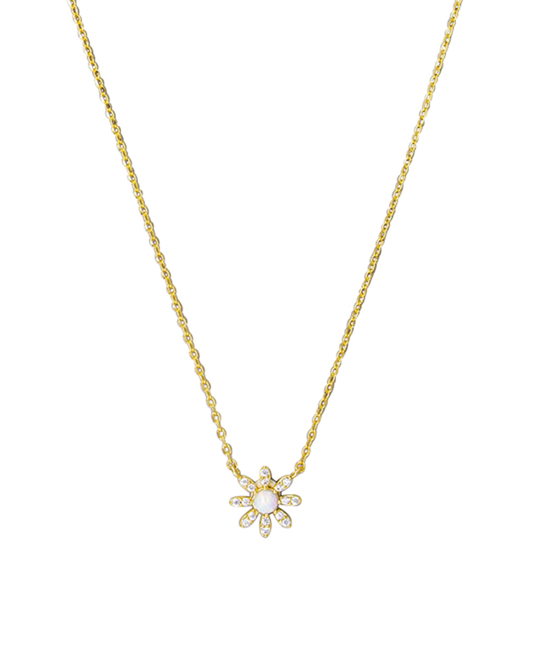 Elevate your jewellery collection with the Seema Necklace, featuring a delicate fine gold chain paired with a charming flower pendant. Accented by a luminous opal crystal, this piece offers a refined blend of elegance and subtle sparkle. Perfect for layering or wearing solo, it adds a sophisticated touch to any outfit with expert craftsmanship and timeless design.