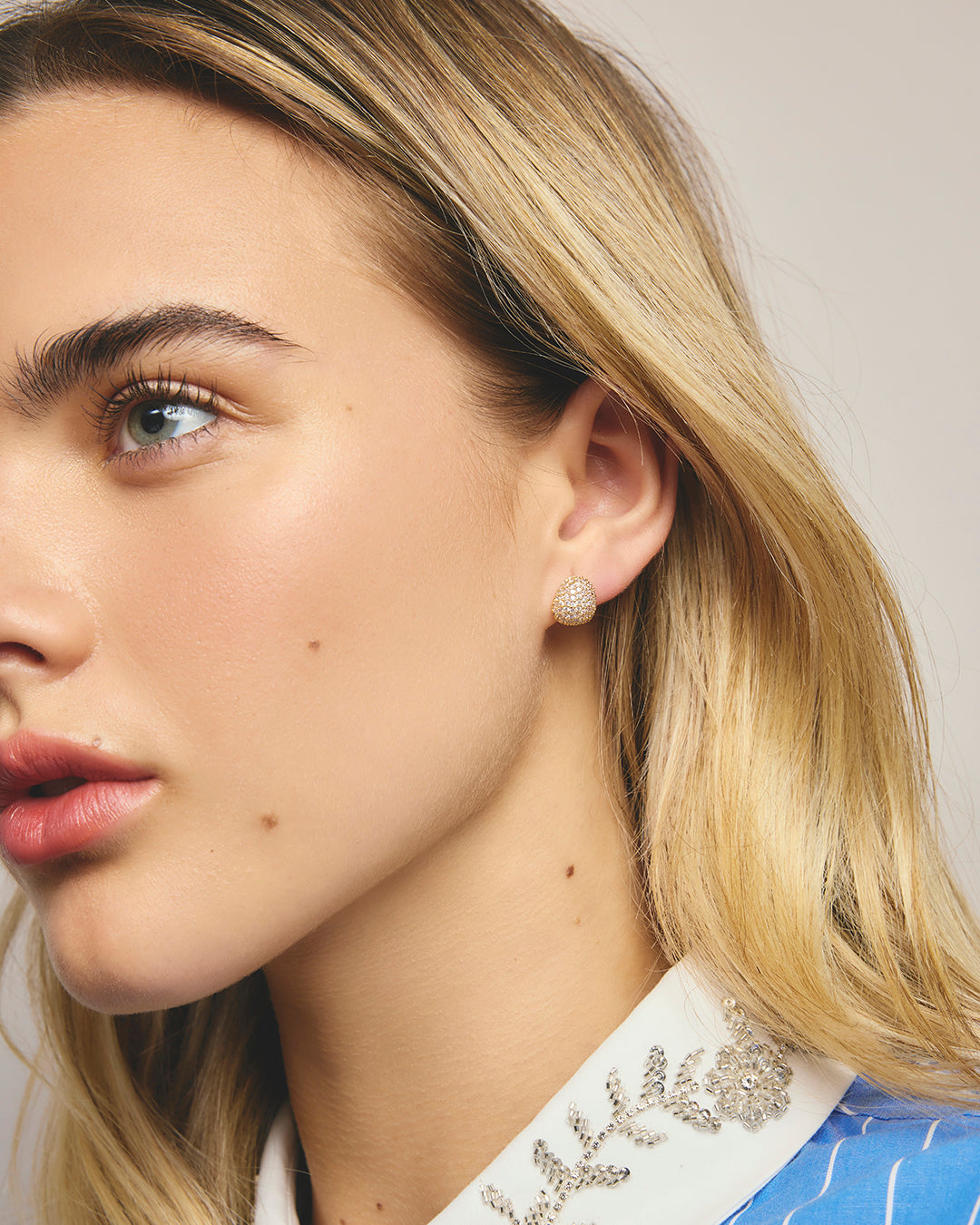 The Elai Studs present a sleek pebble shaped design adorned with precisely inlaid cubic zirconia stones. This expert craftsmanship highlights the subtle sparkle and modern shape, perfect for take your going out looks to the next level.