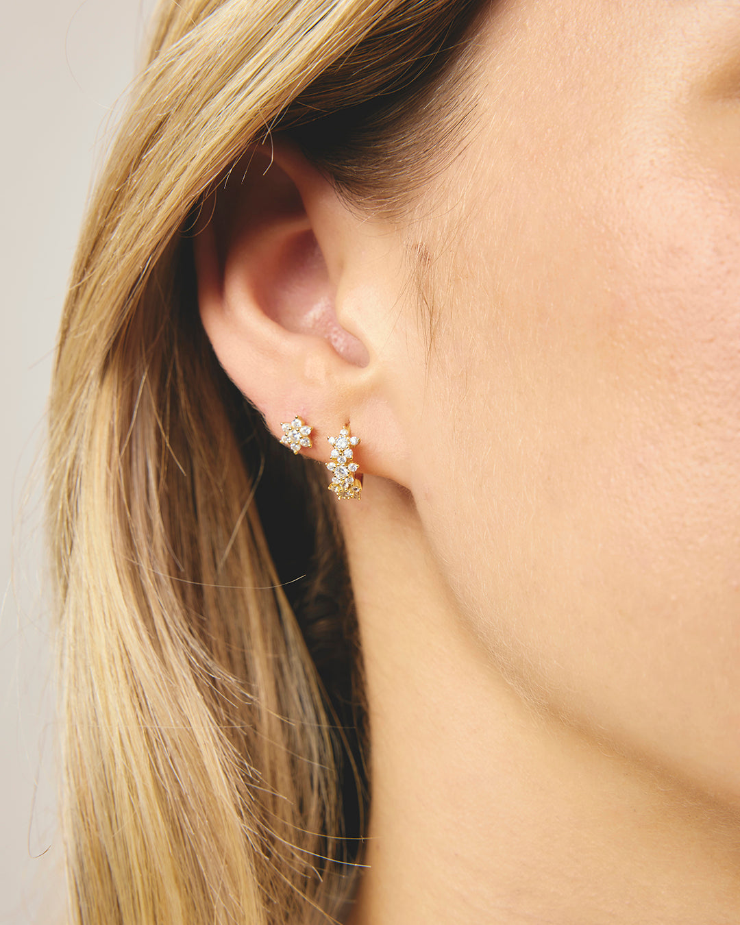 Yelena Sleepers are delicate hoop earrings adorned with a charming trio of crystal flowers. Lightweight and elegant, they add a playful sparkle and a fresh, feminine touch to any outfit.